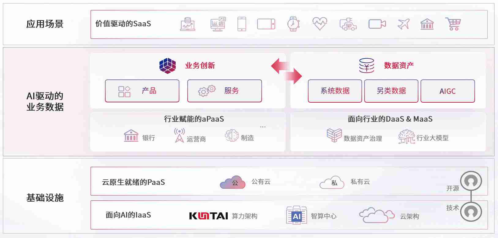 数字时代,,围绕企业数字化转型的关键要素,,,,酷游官网数码开创性的提出数云融合战略和技术体系框架,,,着力在云原生、、、数字原生、、、、AI原生和信创产业上架构产品和服务能力,,,,为处在不同数字化转型阶段的快消零售、、、汽车、、金融、、医疗、、、政企、、、教育、、、、运营商等行业客户提供泛在的敏捷IT能力和融合的数据驱动能力,,,构建跨界融合创新的数字业务场景和新业务模式,,,助力企业级客户建立面向未来的核心能力和竞争优势,,,,全面推动社会的数字化、、、智能化转型升级。。。。